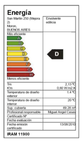 EtiquetaEn Argentina, la norma IRAM 11.900 certifica la Eficiencia térmica de la envolvente para calefacción, en nuestros hogares. La norma establece 8 niveles (desde A hasta H) de eficiencia térmica en un formato similar al de eficiencia energética de los electrodomésticos.